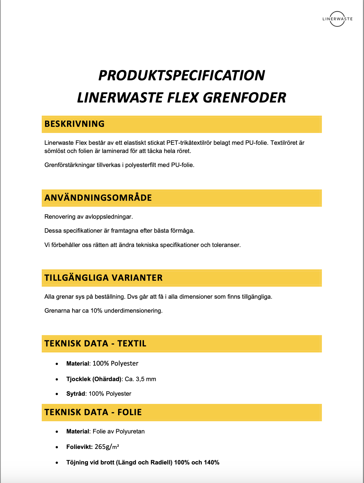 Tekniskt datablad Linerwaste